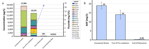 | − | [[File: | + | [[File: XiongFig2.png | thumb | 500 px | Figure 2. Field demonstration of EradiFluor<sup><small>TM</small></sup><ref name="EradiFluor"/> for PFAS destruction in a concentrated waste stream in a Mid-Atlantic Naval Air Station: a) Target PFAS at each step of the treatment shows that about 99% of PFAS were destroyed; meanwhile, the final degradation product, i.e., fluoride, increased to 15 mg/L in concentration, demonstrating effective PFAS destruction; b) AOF concentrations at each step of the treatment provided additional evidence to show near-complete mineralization of PFAS. Average results from multiple batches of treatment are shown here.]] |