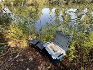 Figure 6. iTIES deployment at the Rouge River, Detroit, MI. In the foreground is the iTIE Cooler Sub-System, which contains iTIE resin treatments and test organism groups, as well as the oxygenation coil and sample collection bottles. Next to the iTIE Cooler are the two pump cases. The Trident can be seen above the pump cases, installed in the river channel near shore.