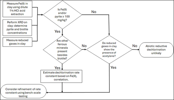 Figure 2 presents a decision flowchart designed to evaluate the significance and extent of abiotic reductive dechlorination. By applying Equation 1 to the dilute acid extractable Fe(II) plus measured mineral species data from clay samples, the reactive ferrous iron content (Fe(II)r) can be quantified, enabling a streamlined assessment of the extent to which abiotic processes are contributing to the mitigation of contaminant back-diffusion.
